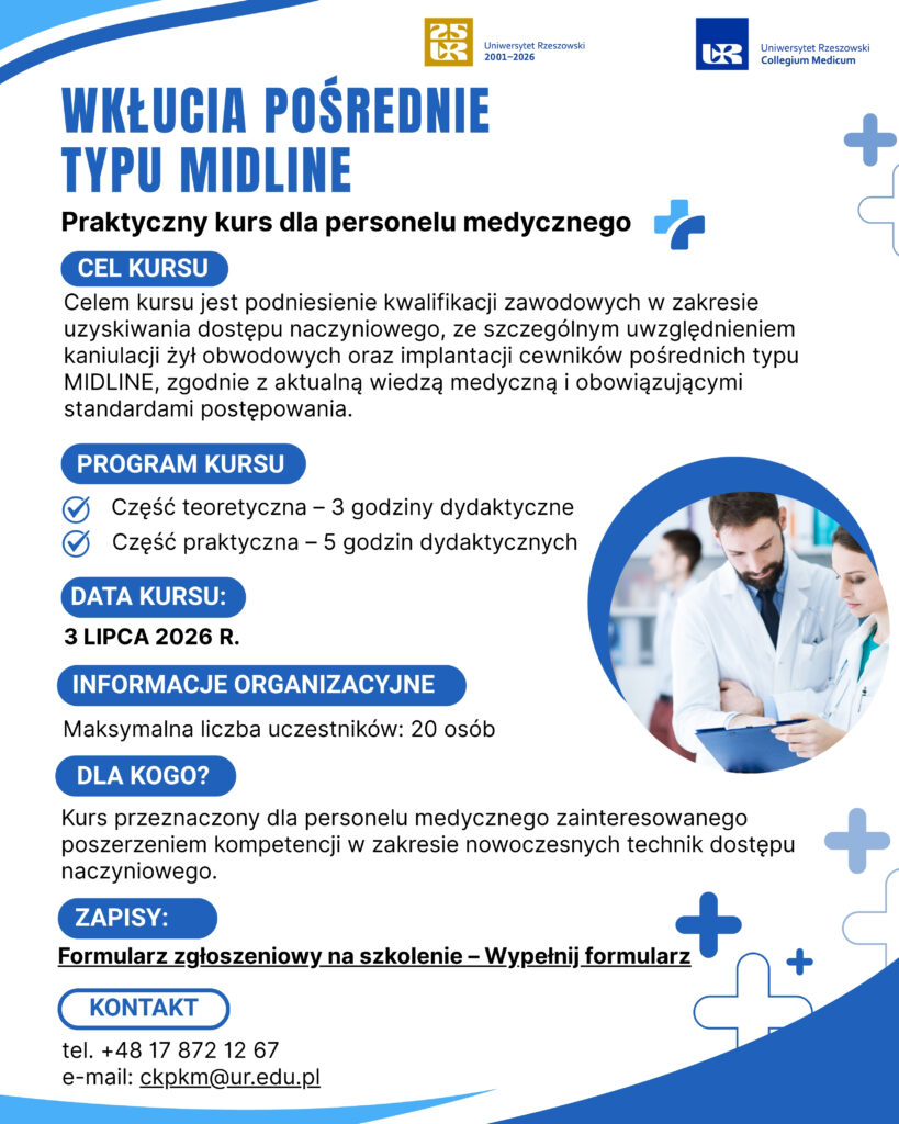 - część teoretyczną (3 godziny dydaktyczne), m.in. anatomia kliniczna żył, trudny dostęp naczyniowy, implantacja cewników MIDLINE, powikłania,