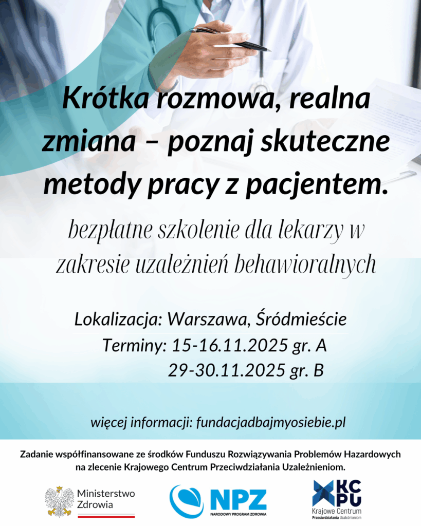 Szkolenie ma na celu zwiększenie kompetencji lekarzy w zakresie diagnozy uzależnień behawioralnych oraz skutecznej komunikacji z pacjentem. Obejmuje zagadnienia z zakresu Dialogu Motywującego i Terapii Poznawczo-Behawioralnej, a jego program został dostosowany do realiów pracy lekarzy różnych specjalizacji, w tym POZ, psychiatrii, pediatrii, medycyny pracy i innych.